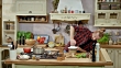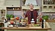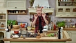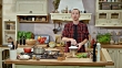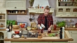 Wide dolly shot of a male chef talking to his viewers while blending vegetables for a nice cream soup. Shot in Slovenia.