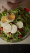 Vertical video of Male chef decorating salad with egg slice. Slow-motion footage.