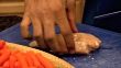 TD MS Male hands w/ knife trimming fat off end of chicken breast half resting on blue cutting board on kitchen island, fingers lifting raw meat, checking other side. Healthy Lifestyle, diet, low fat, lean, poultry, white meat.