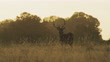 Male Red Deer Stag (cervus elaphus) during deer rut at sunset in beautiful golden orange sunlight in fern and forest landscape and scenery, British wildlife in England, UK - 4K stock video