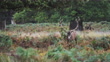 Male Red Deer Stag (cervus elaphus) during deer rut at sunset in beautiful golden sun light in fern and forest landscape and scenery, British wildlife in England, UK - 4K stock video
