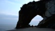 Rear view of man walking towards famous Tusan Cliff Sarawak. Full length of male tourist is looking at natural rocky arch. He is enjoying vacation at beach also known as Horse rock in Miri.