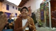 Male traveler friends eating on outdoors restaurant in Cusco, Peru