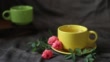 Man adding tea powder in hot yellow cup of water in back textured background
