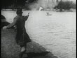 B/W 1916 man at edge of water shooting gun at people on distant rowboat in body of water / feature - stock video