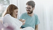 Bearded man bringing hot soup to young woman who having flu