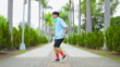 slow motion asian man wearing headset is dancing with mv music in park
