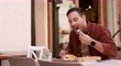 Man enjoying tasty quesadilla at outdoor cafe table. - 4K stock video