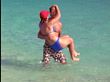 Man holding woman above shallow ocean water / smiling woman splashing water into his hair - stock video