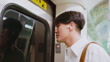 close up asian businessman is listening podcast or breakfast news through earbuds and looking carriage moving while standing commuting at metro mrt car