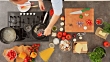 Directly above shot o of man preparing spaghetti in the kitchen.