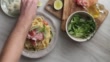 Man serving pasta with herb cream sauce, prosciutto and basil - HD stock video