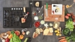 Directly above shot of steak being served on the plate, decorated with pumpkin sauce and cherry tomatoes.