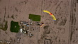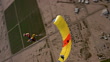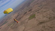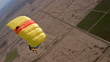 WS Man skydiving and floating in mid air with large yellow parachute above patchwork landscape / Eloy, Arizona, USA - HD stock video