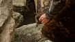 A shot between rock formations, a Swamp Wallaby was staring on a man standing near.