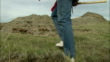 A man with a pickax walks to a grassy hill overlooking Hell Creek. - HD stock video