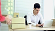 Man working using laptop check packing list order. Woman sent packing box for shipping parcel package at office. Delivery Shopping online.