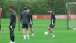 MANCHESTER, ENGLAND - SEPTEMBER 24: Manchester United players, Christian Eriksen, Mason Mount and Toby Collyer warm up during a training session ahead of their Europa League match against Twente during a press conference at Carrington Training Ground on September 24, 2024 in Manchester, England. (Footage by Niche Sport Media via Getty Images)