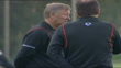 Manchester United training; Sir Alex Ferguson (Manager of Manchester United) talking to coach (not heard) / Back view of Players running along with coach PAN to Wayne Rooney and Kieran Richardson passing ball to Patrice Evra (Manchester United) an others