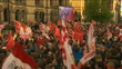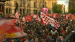 Premier League: Manchester United victory parade: GVs parade; ENGLAND: Manchester: Albert Square: EXTCrowd in front of stage waving flags and banners and giant screen on stage in background / The Courteeners (Band) performing on stage SOT