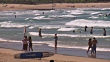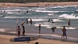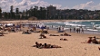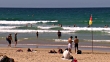 Manly Beach - Wide shot, busy beach with sunbathers and swimmers / Tighter shot, side angle, waves rolling in, swimmers and Lifeguard board on the sand / front view, red and yellow surf lifesavers flag flying, waves rolling in swimmers and sunbakers on the beach / Tighter shot, waves rolling in, swimmers body surfing / Blue and White 'Hire Umbrellas' and deck chairs on the sand, including volleyball courts in the background / South Steyne promenade - Wide shot of promenade with tourists walking - Norfolk Island Pines and beach