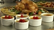 CU, Man's hand placing raspberries on creme brulee, roasted chicken in background - HD stock video