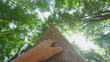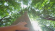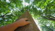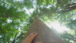 Slow motion POV shot of a man's hand touching a tree trunk. Low angle view of tree canopies.