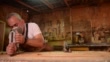 Manual worker with mask using a hand planer on a piece of wood in carpentry workshop - HD stock video