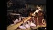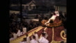 Marching band, "Bulldog Band" on the drums; yellow sports car decorated with flowers with the sign "Grand Marshal"; another car with the sign "President Tournament of Roses"; two men marching with the banner "Our American Heritage"; man holding the banner " ...r Majesty ..e Queen"; float made to look like giant dress with woman in crown and holding roses on the top, women in white dresses holding roses sitting on the side of the giant dress