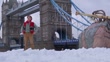 Film: 'The BFG': Mark Rylance interview; ENGLAND: London: City Hall:EXT / RAIN'The BFG' sign' / Tower Bridge / Mark Rylance (Actor) with Ruby Barnhill (Child actress) on fake snow for photocall
