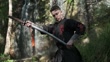 Martial artist practicing katana techniques beside cascading waterfall, dense forest vegetation framing powerful movement - 4K stock video