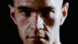 Super slow motion shot of a young man covered in sweat after intense workout.