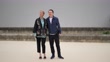 PARIS, FRANCE - JUNE 25: Mathilde Favier (L) wears gold earrings, a blue silk shirt, a black jacket with pale blue / orange and black embroidered pattern, black suit pants, a black suede Dior clutch, black suede open toe-cap mules / block heels shoes ; Guillaume Gallienne (R) wears a white t-shirt, a navy blue zipper blazer jacket, black suit pants, a black suede Dior clutch, navy blue and yellow detail ankle sneakers, outside Dior, during Paris Fashion Week - Menswear Spring/Summer 2022, on June 25, 2021 in Paris, France. (Footage by Edward Berthelot/Getty Images)
