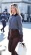 MILAN, ITALY - FEBRUARY 27: (SLOW-MO) Mathilde Goehler wears grey cardigan, brown suede shorts, tights, white Prada buckle bag, gloves outside Prada during the Milan Fashion Week Womenswear Fall/Winter 2025/2026 on February 27, 2025 in Milan, Italy. (Footage by Christian Vierig/Getty Images)
