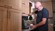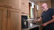 Mature man pouring a coffee and smelling the mug at home during the morning