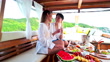 Sweet couple lover in boat touring are enjoy moment with meals lunch celebration together on boat floating at middle of the sea in summer season