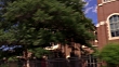 MEDIUM ANGLE DRIVING POV 3/4 RIGHT FORWARD OF URBAN AREA STREETS, OVERPASS FENCE, BRICK BUILDING WHICH COULD BE CHURCH OR PAROCHIAL SCHOOL.