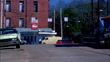 MEDIUM ANGLE OF 1967 RED DODGE CHARGER DRIVING TOWARDS POV. SEE CHARGER SPIN AND CHANGE DIRECTION, DRIVING AWAY FROM POV. SEE VINTAGE TRUCK DRIVING IN OPPOSITE DIRECTION TOWARDS POV. SEE CHARGER SWERVE AND PASS TRUCK. SEE BRICK BUILDING IN COUNTRY TOWN IN BACKGROUND, CARS PARKED ALONG STREETS, "HIRES ROOT BEER" SIGN.
