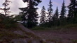 MEDIUM ANGLE OF A LARGE GREEN AND WHITE RV DRIVING ON ROCKY MOUNTAIN ROAD. TALL PINE TREES IN BACKGROUND, POSSIBLY WOODS OR FOREST. WILDERNESS. LARGE ROCK IN FOREGROUND. RV HAS ORANGE WRITING ON SIDE: "RENT ME!" MOTORHOMES. - HD stock video