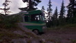 MEDIUM ANGLE OF A LARGE GREEN AND WHITE RV DRIVING ON ROCKY MOUNTAIN ROAD. TALL PINE TREES IN BACKGROUND, POSSIBLY WOODS OR FOREST. WILDERNESS. LARGE ROCK IN FOREGROUND. RV HAS ORANGE WRITING ON SIDE: "RENT ME!" MOTORHOMES.