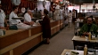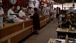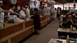 MEDIUM ANGLE OF COUNTER IN DELI OR RESTAURANT. CUSTOMERS EATING AT TABLES. WOMAN ORDERING AT COUNTER. KATZ DELICATESSEN.