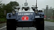 MEDIUM ANGLE OF STRAIGHT BACK PROCESS PLATE OF BLUE AND WHITE SECURITY VEHICLE OR CAR ON ROAD. FRONT CENTER HOOD READS SECURITY IN WHITE LETTERS AND DA VINCI VITRUVIAN MAN LOGO IN RED AND WHITE. - HD stock video