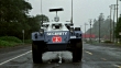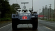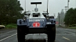 MEDIUM ANGLE OF STRAIGHT BACK PROCESS PLATE OF BLUE AND WHITE SECURITY VEHICLE OR CAR ON ROAD. FRONT CENTER HOOD READS SECURITY IN WHITE LETTERS AND DA VINCI VITRUVIAN MAN LOGO IN RED AND WHITE. UNDER RIGHT HEADLIGHT READS 105 IN WHITE LETTERS. ON TOP OF VEHICLE IS A ROTATING RADAR READER. TWO ANTENNAS ON SIDES OF RADAR. ZOOMS IN ON SECURITY AND LOGO ON HOOD. TREES, HOUSES, ELECTRIC WIRES ON BOTH SIDES OF STREET.