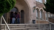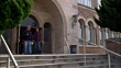 MEDIUM ANGLE OF STUDENTS CARRYING BACKPACKS AND BAGS STANDING IN FRONT OF BROWN DOOR OF TAN SCHOOL AT TOP OF STAIRS. SEE WHITE RAILING GOING DOWN STAIRS. SEE TWO SKINNY BROWN DOORS ON EACH SIDE OF DOUBLE DOORS GROUP OF STUDENTS IS STANDING IN FRONT OF. SEE ARCH ON OUTSIDE OF DOOR WITH FADED GREEN LANTERN ON RIGHT SIDE OF ARCH. SEE SIGN OVER DOOR READING "ENTER TO LEARN GO FORTH FOR SERVICE." SEE PUFFY GREEN TREES ON EACH SIDE OF STAIRS. SEE TWO MALE STUDENTS WEARING JEANS AND CASUAL SHIRTS HOLDING BOOKS AND LUNCH SACK TALKING WITH EACH OTHER. SEE GROUP OF STUDENTS STANDING INSIDE DOORWAY.<P><A href="HTTPS://WWW.SONYPICTURESSTOCKFOOTAGE.COM/FOOTAGE?KID=4365">FOR DAY-NIGHT MATCHING SHOTS, CLICK HERE.</A><P>