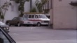 MEDIUM ANGLE, SEE DARK COLORED 1985 JAGUAR XJ-6 LUXURY CAR WITH BROKEN RIGHT HEADLIGHT DRIVE AROUND BUILDING, SPEED ONTO STREET WITH MANY PARKED CARS. SEE HOME OR APARTMENT AT RIGHT. COULD BE SMALL TOWN OR SUBURBAN NEIGHBORHOOD. SHOT COULD BE USED AS PART OF CHASE SEQUENCE.