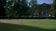 MEDIUM ANGLE SHOT OF COLLEGE STUDENTS PLAYING FRISBEE ON LAWN. SEE TREES IN BACKGROUND AND BUILDING WITH COLUMNS TO RIGHT OF BACKGROUND. STUDENT THROWS FRISBEE TOWARDS CAMERA AT END OF SHOT.