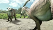 Medium Long Shot pan-right - A Parasaurolophus grazes near its herd in a computer-generated animation. / Los Angeles, California, USA - HD stock video