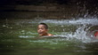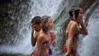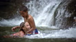 Medium shot children sitting in cascade of waterfall/ swimming in stream/ Stony Brook State Park, New York - HD stock video