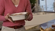 Medium shot - close-up Woman serving casserole dinner at kitchen table - HD stock video