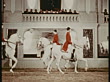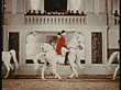 Medium shot male equestrians riding Lipizzaner horses in formation w/people in balcony above watching - stock video
